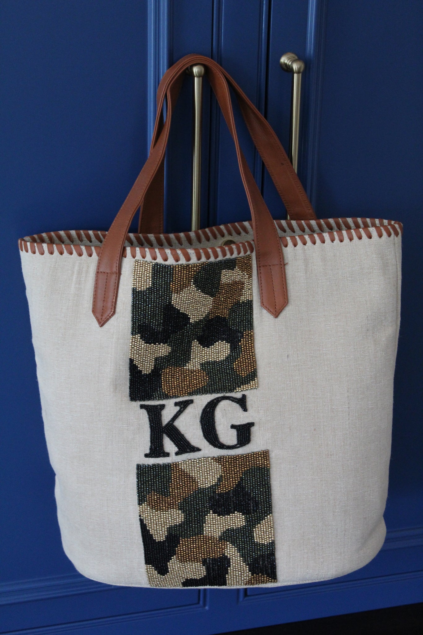 The bag is 100% hand beaded and handmade. Your choice of natural, pink or black linen with your choice of stripes, design and monogram. Each bag is lined with satin and has a snap closure. Handles and whipstitching are leather.